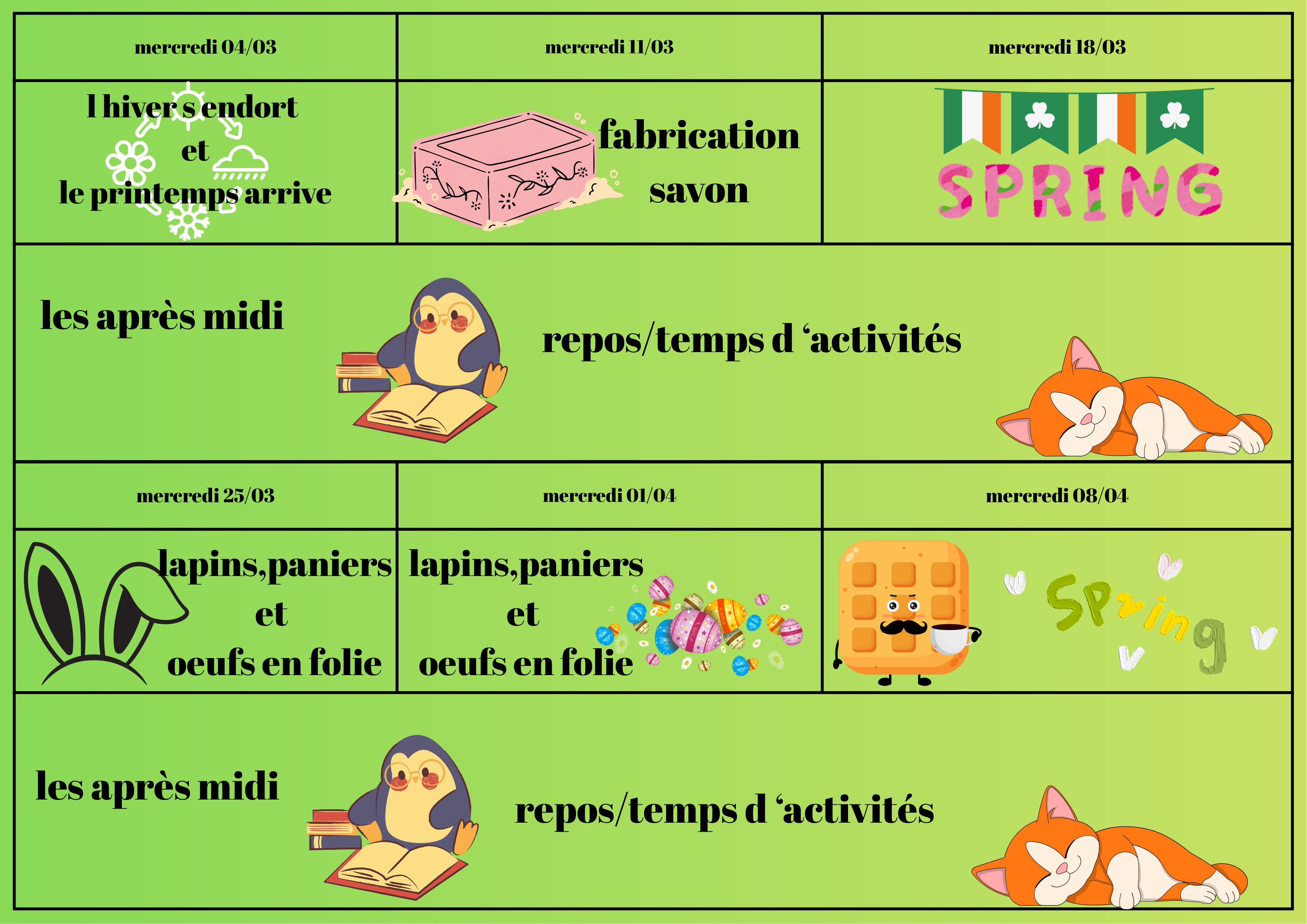Le Centre de Loisirs est ouvert durant les vacances de février, de Pâques, d'été, de la Toussaint, et les mercredis durant la période scolaire.